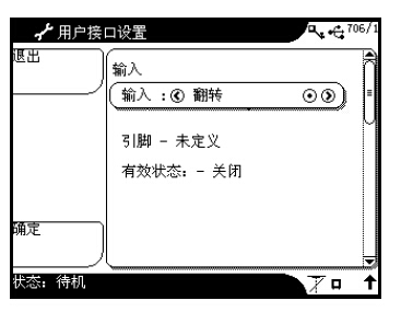 在“用户端口”设置屏幕上,选择“输入”选项为“翻转”、“颠倒”或“CSR数据”。接着选择SK2上将要接收信号的引脚(引脚1到8),然后选择“有效状态”(以下示列为关闭状态,表示未设置“翻转”的外部控制)。