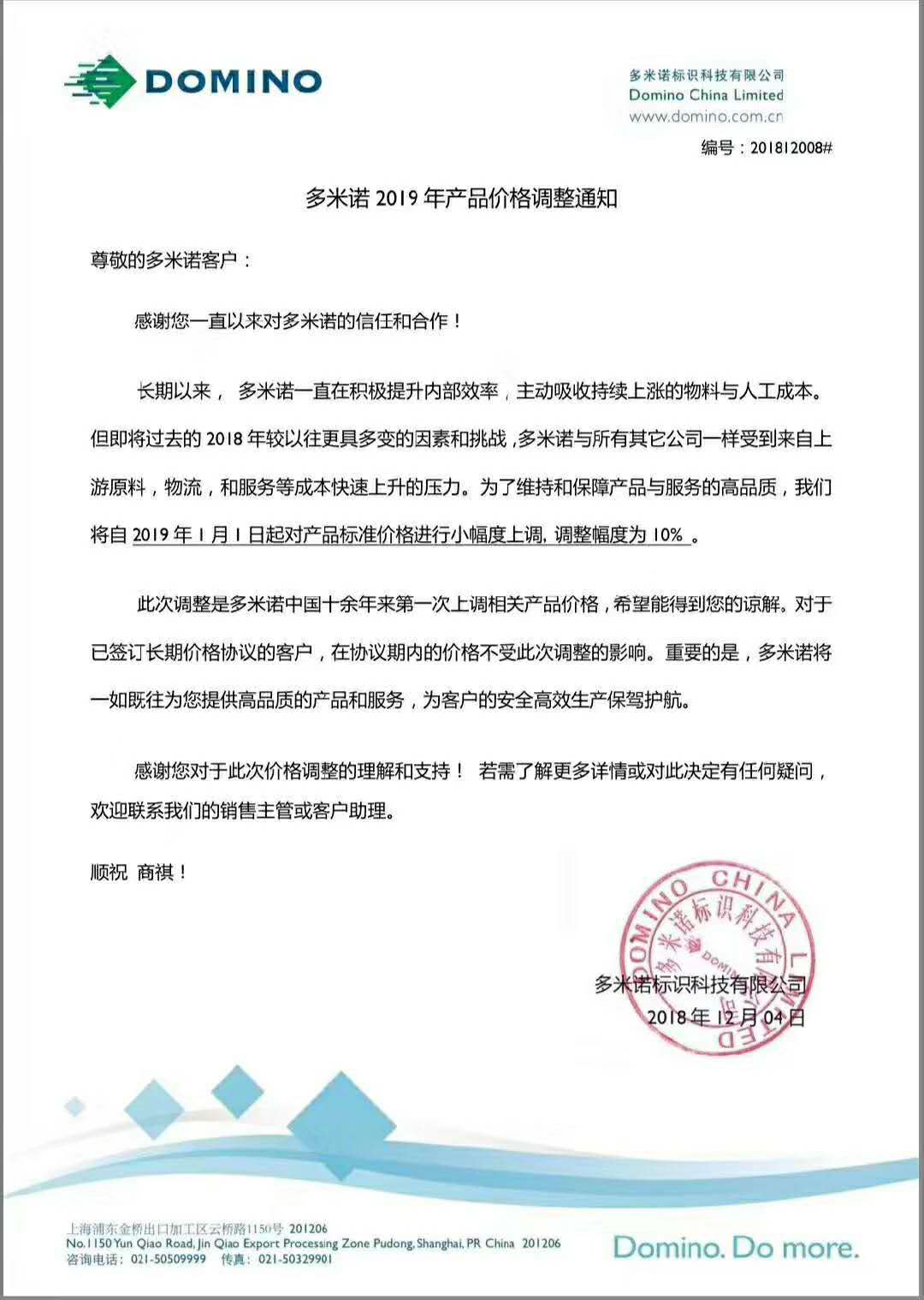 但即将过去的2018年较以往更具多变的因素和挑战,多米诺与所有其它公司一样受到来自上游原料、物流和服务等成本快速上升的压力。为了维持和保障产品与服务的高品质,我们将自2019年1月1日起对产品标准价格进行小幅度上调,调整幅度为10%。